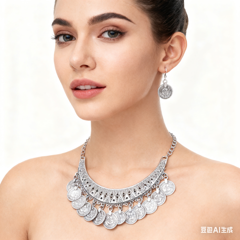 ビンテージエキゾチックスタイルコインタッセルネックレスとイヤリングセットシルバーコイン鎖骨チェーン写真アクセサリー合金製
