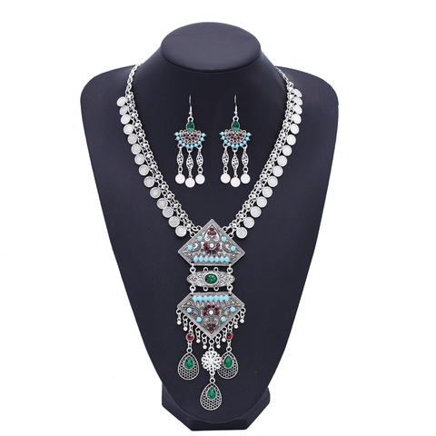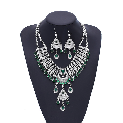 ヴィンテージエスニックスタイルレディースネックレスイヤリングセットグリーンレッドクリスタルラインストーン合金シルバーカラーチェーンウェディングジュエリーセット